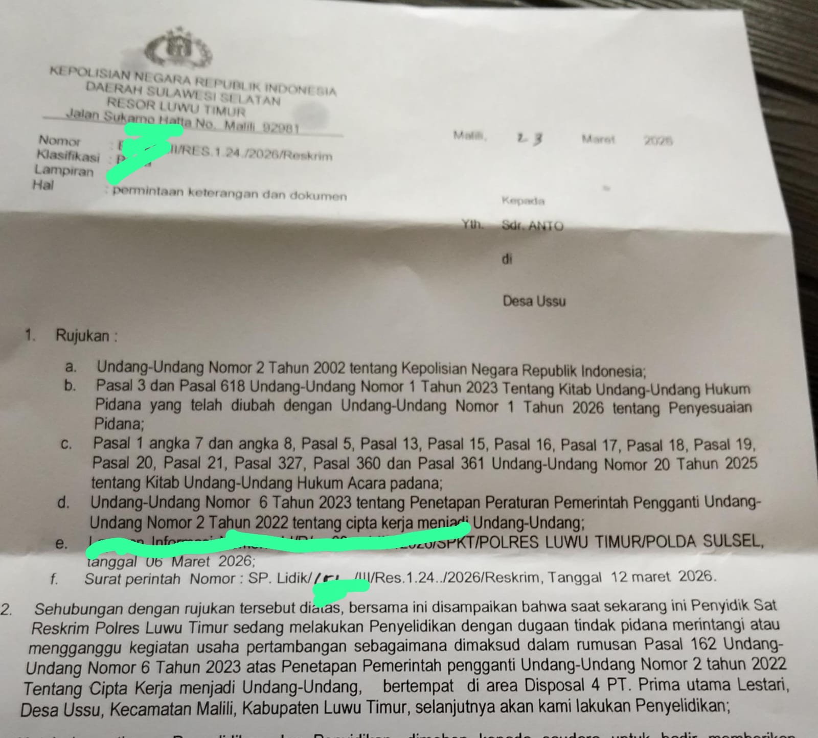 GASKAN INDONESIA, LUTIM–Sejumlah warga Desa Ussu, Kecamatan Malili, Kabupaten Luwu Timur, harus menghadapi panggilan aparat kepolisian setelah dilaporkan oleh PT Prima Utama Lestari (PT PUL) atas tuduhan merintangi aktivitas pertambangan.