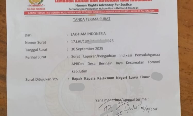 Luwu Timur, GASKANINDONESIA.COM – Lembaga Lak HAM Indonesia (LHI) secara resmi telah memasukkan laporan dugaan tindak pidana korupsi Anggaran Pendapatan dan Belanja Desa (APBDes) di salah satu desa Kecamatan Tomoni ke Kejaksaan Negeri Luwu Timur, Rabu, 1 Oktober 2025.