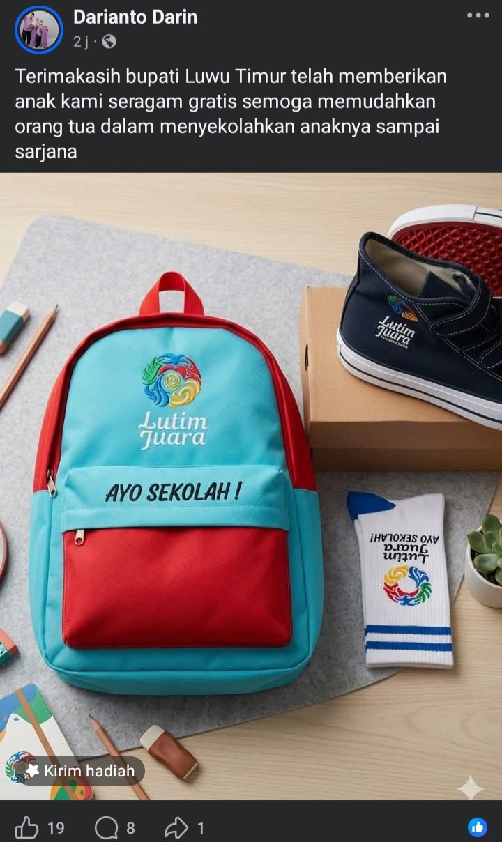Hal yang senada juga diunggah oleh akun Facebook Susanti Susan yang menuliskan “Terimakasih pak BUPATI LUWU TIMUR atas program seragam perlengkapan sekolah, semoga sukses terus LUWU TIMUR.”
